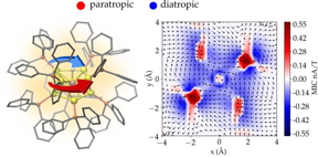 Home > Press > Researchers analyzed circulating currents inside gold nanoparticles: A new method facilitates accurate analysis of magnetic field effects inside complex nanostructuresThe atomic structure of a gold nanoparticle protected by phosphine molecules (left) and magnetic-field-induced electron currents in a plane intersecting the center of the particle (right). The...