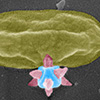 | A scanning electron microscopy image of the MOF-on-MOF surface with sharp nanotips killing the bacteria. The image was taken in Myfab’s cleanroom at Chalmers University of Technology. Parts of the image have been colored. (Image: Zhejian Cao, Chalmers University of Technology)